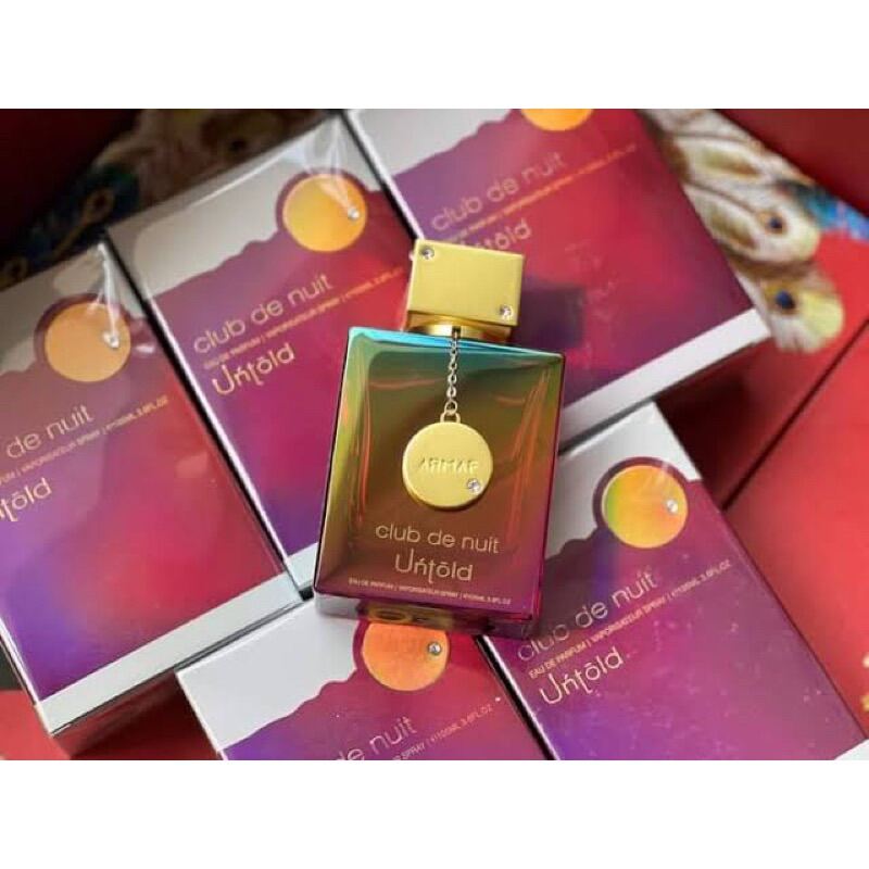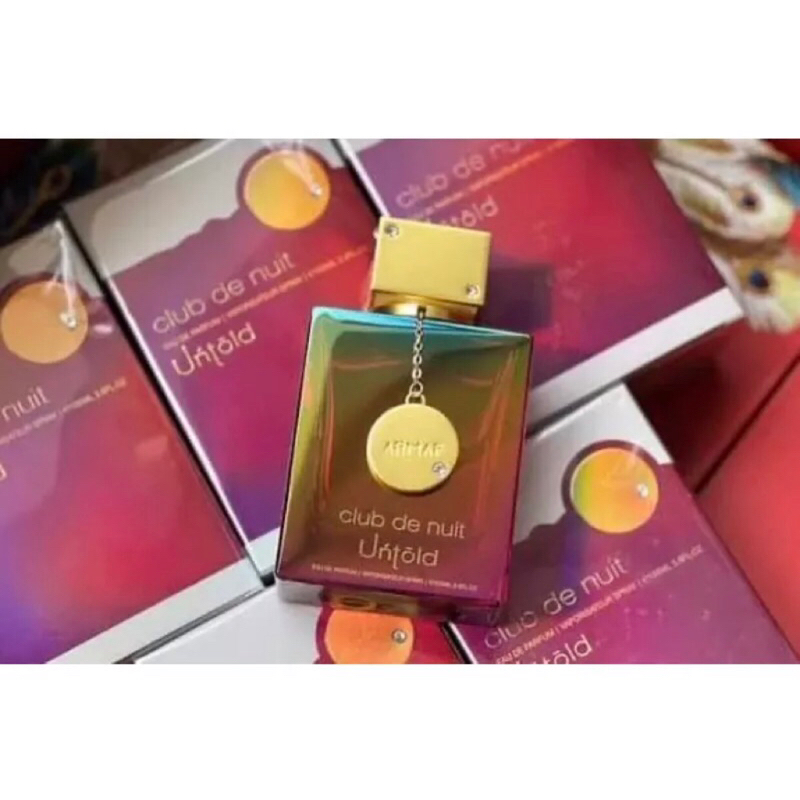Armaf Club De Nuit Untold EDP 105ml . Top notes are Saffron and Jasmine; middle notes are Amberwood and Ambergris; base notes are Fir Resin and Cedar. The captivating blend of saffron and jasmine creates a luminous and dynamic introduction, exuding an aura of opulence and refinement